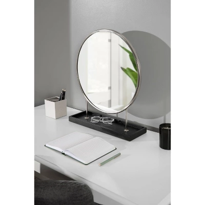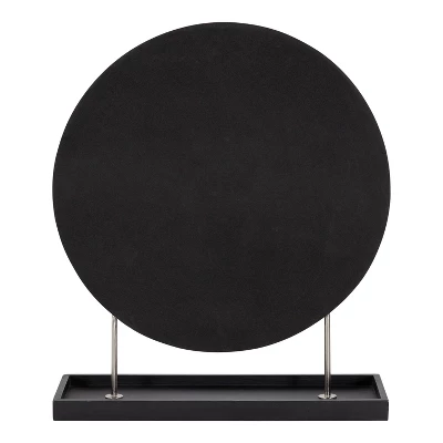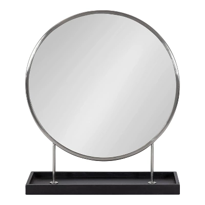 Create a captivating and beautiful centerpiece on your table with the gorgeous Maxfield table mirror. The Maxfield tabletop mirror takes inspiration from glamorous, modern design to create a beautiful accent piece for your home. It features a trendy, circular mirror elevated by a metal frame attached to a solid wood base. This mirror is handcrafted in India by skilled artisans, making each piece in the collection distinct in woodgrain and finish. The metal frame features a lovely silver finish, while the wood base has a refined black finish to create an elegant look that elevates the tone of your space. The Maxfield’s overall dimensions are 18 inches wide by 6 inches deep by 22 inches tall, making it a staggering centerpiece on a vanity, console table, dresser, or dining room table. The wood base attached to the mirror adds an extra dimension of functionality to the mirror, providing a surface to quickly stash jewelry, makeup powder, keys, and more. This tabletop mirror has an easy assembly process, with only 2 steps separating you from this modern statement piece’s full beauty.
