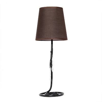 A unique styled lamp with a winding black metal base and ivy-like details for a bit of a feminine influence to inspire a lovely illumination of your space. Crystals shimmer beneath the brown tapered drum fabric shade for an overall warm, inviting feel to add into your decor and space of choice.