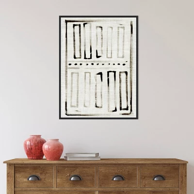 ART DESCRIPTION: Thick blots of ink create a geometric pattern of rectangles and spots across loosely-woven fabric. The soft beige of the cloth and the gentle pooling of the ink create a feeling of ancient artifacts and handcrafted artwork. This Amanti Art canvas art print was created by Jennifer Paxton Parker and printed by Amanti Art in Madison WI. The canvas is stretched by hand and finished with a float frame. Individually made using traditional custom framing techniques, it has the quality you would expect from your local frame shop. Because of our attention to detail and focus on artistry, architects, interior designers, and homeowners alike choose this framed canvas artwork to create beautiful living spaces.