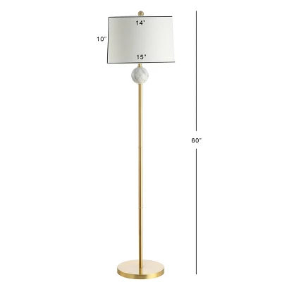 A modern classic, this understated floor lamp has a brass-gold finish and a marbleized resin accent. The rich marble and gold combination suits traditional and modern interiors. Quality details include a foot-step switch and silk-wrapped cord. 60″ height is perfect for general lighting or reading. On-off foot-step switch. Eco-friendly 9W LED bulb included. Takes one bulb and compatible with any 12W LED or 100W TYPE “A” or 23W CFL. UL Listed. Before cleaning any lamp shade or fixture, disconnect the power source. Wipe with a soft, dry cloth. Avoid the use of chemicals and household cleaners as they may damage the finish.