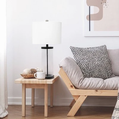 Classic yet contemporary this lamp will light up any room in your home with style! This lamp features a clear glass cylindrical base with black metal on top and bottom for a clean, sophisticated look. Perfect for your living room, bedroom, office, or anywhere you need to add a tasteful update!