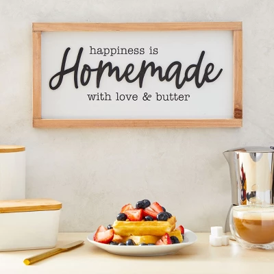 Create one-of-a-kind wall decor in your kitchen, bakery, or coffee shop with this farmhouse kitchen sign that features text that reads “Happiness is Homemade”. The rectangular sign is made from high-quality wood that won’t easily tarnish. Gift the happiness is homemade sign to a loved one at an upcoming baby shower, anniversary, or gift exchange, the decorative text will effortlessly elevate your rustic kitchen wall decor.