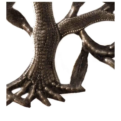 Crafted from recycled 55-gallon steel drums by village artisans in Haiti, these stunning pieces of art are truly one-of-a-kind! The process of turning sheets of metal into beautiful art is all done by hand. Steel drums used to transport oil into the capital of Haiti are cut, the oil is burned off to clean the metal, and then flattened in order to create stunning, upcycled art. Suitable for Indoor or Outdoor Use. Type: Metal Wall Art Colors: Metallic Materials: Upcycled Steel Metal Finish: Lacquer Dimensions: Approx. 24 Diameter Care: If displaying outdoors it is recommended to spray with a clear coat once or twice a year, as prolonged exposure to the elements will cause rust. Hanging Instructions: To hang metal art simply use pin head nails in the many nooks and spaces available in the design. If nails are shiny, you may want to darken heads with a black marker to help nails visually disappear. Given the handmade nature of this product please allow for minor variations. Color may vary due to the process of cleaning the steel drum; when the residual oil is burned off, it creates a range of color from darkened patina to steel-like. If handpainted, exact colors may vary, which speaks to the one-of-a-kind nature of each piece. Each piece of metal art whether painted or natural is coated with a layer of clear lacquer to help protect the metal.