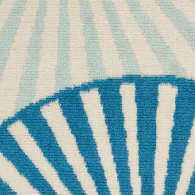 An array of overlapping orbs create captivating energy and vibrance in this Grafix runner rug. Radiating circular patterns in soft blue, white, and beige adorn a subtle ivory field in a burst of contemporary flair.
