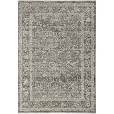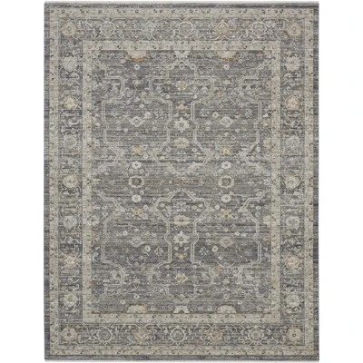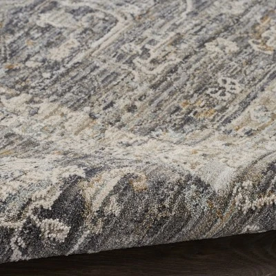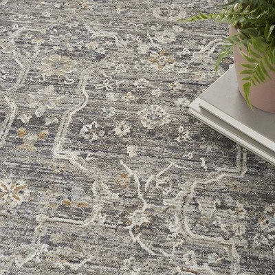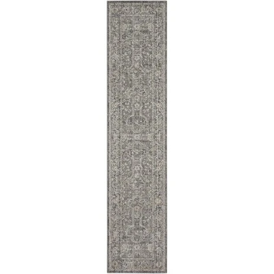 Elevate your décor with the vintage charm of this Persian floral rug from the Nyle Collection. Showcasing an elaborate pattern in slate grey and ivory multicolor, the design is finished with an abrash effect that mimics an antique look. Machine-made from softly textured, easy-clean fibers with metallic serged edges, fringe at both ends, and subtle high-low accents. Runners do not include the fringe.